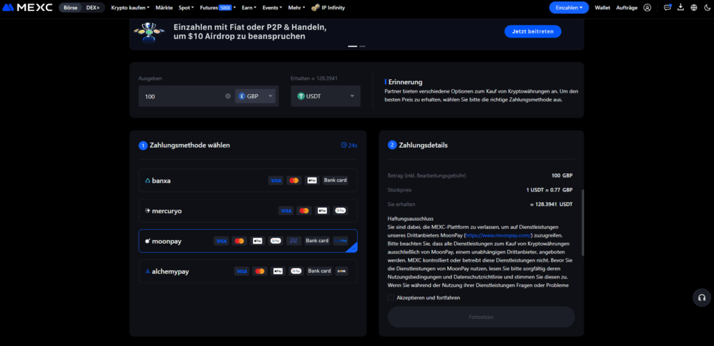 Man kann bei MEXC sowohl mit Fiatwährung einzahlen, als auch mit Kryptowährung. Man kann also beispielsweise Tether (USDT) direkt mit Kreditkarte kaufen, um später in ASTER/USDT investieren zu können.